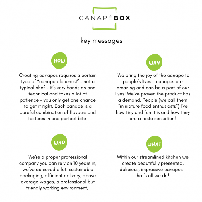 This makes it much easier to write the words that really speak to these individuals – even though everyone has different personalities, the nature of their roles and the industries they are in and the lifestyles they lead – which our client Chris understands from having been in the business of canape creation 10 years and counting.