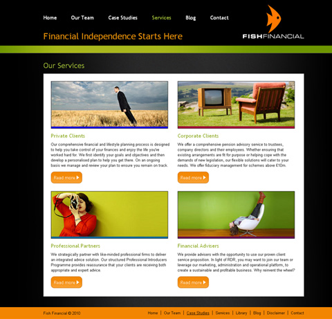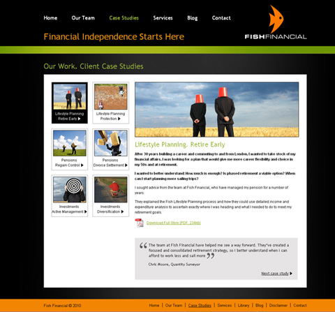 ““We really wanted to push the boundaries with the Fish website. Financial services firms are traditionally very conservative and while we have a serious message to convey, we wanted to do it in a colourful and quirky way. We elected to use case studies to illustrate the breadth of our services, which we coupled with testimonials to give the site a more personalised feel. The feedback we’ve received from our clients and business partners has been fantastic – it’s even translated into new business! Thanks Keren and the team at Top Left Design.”