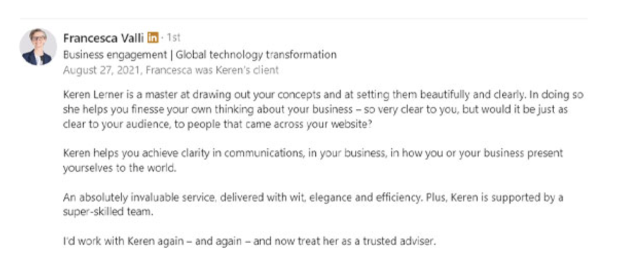 Below is a screenshot of the LinkedIn testimonial Francesca wrote for us, another thing we naturally loved!